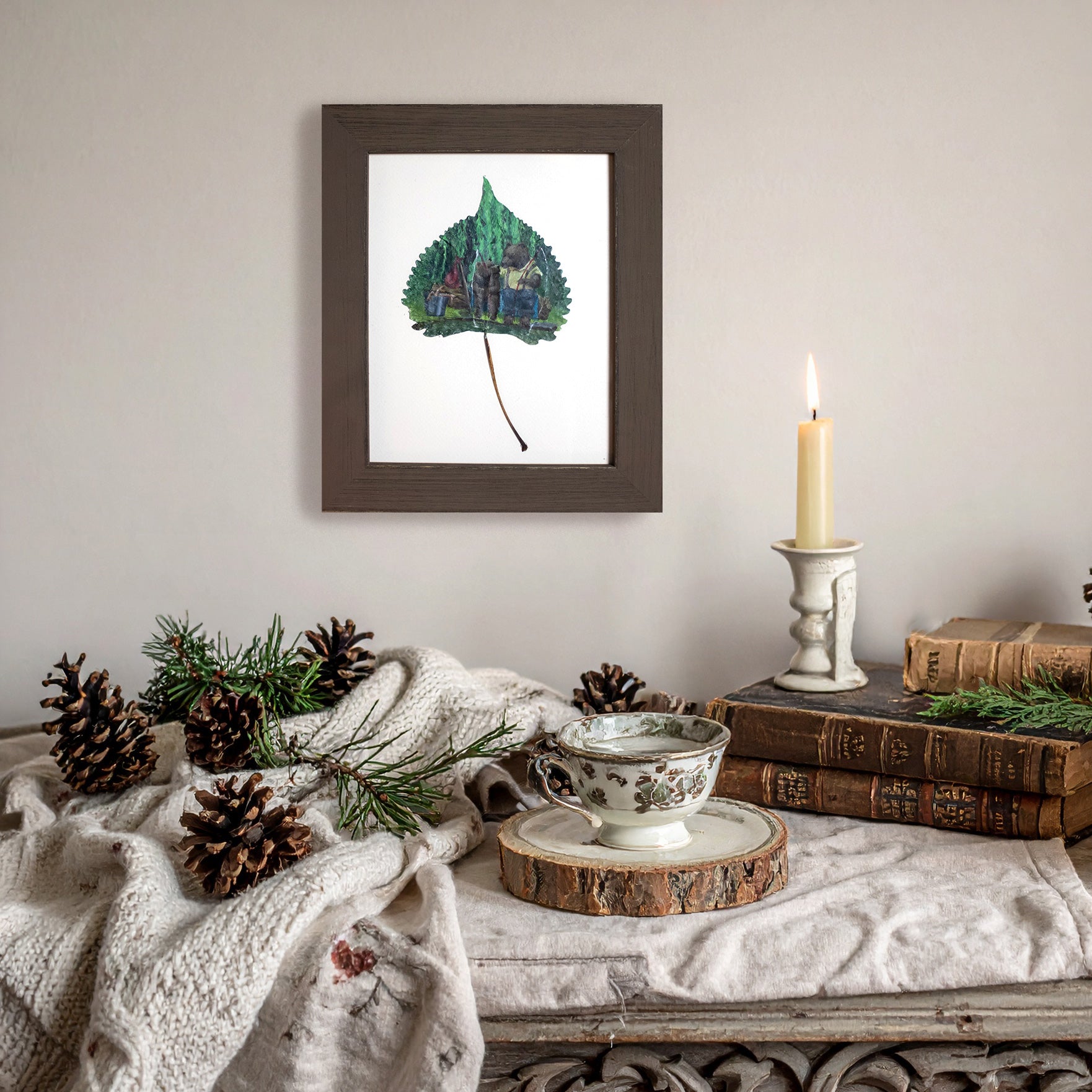 Step into a gentle woodland story with Fishing with Father Bear, an original painting on a real cottonwood leaf. Beneath the shade of a willow tree, a father bear and his cub spend the day fishing along the riverbank, their bucket filled with a bountiful catch. This tender scene of family, nature, and simple joys captures the heart of woodland life and adds a touch of storybook wonder to your home.