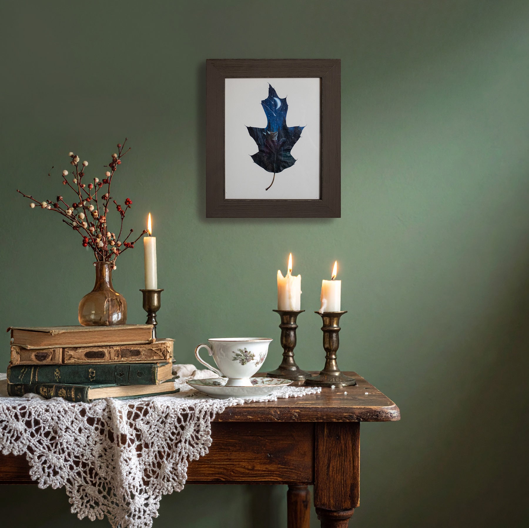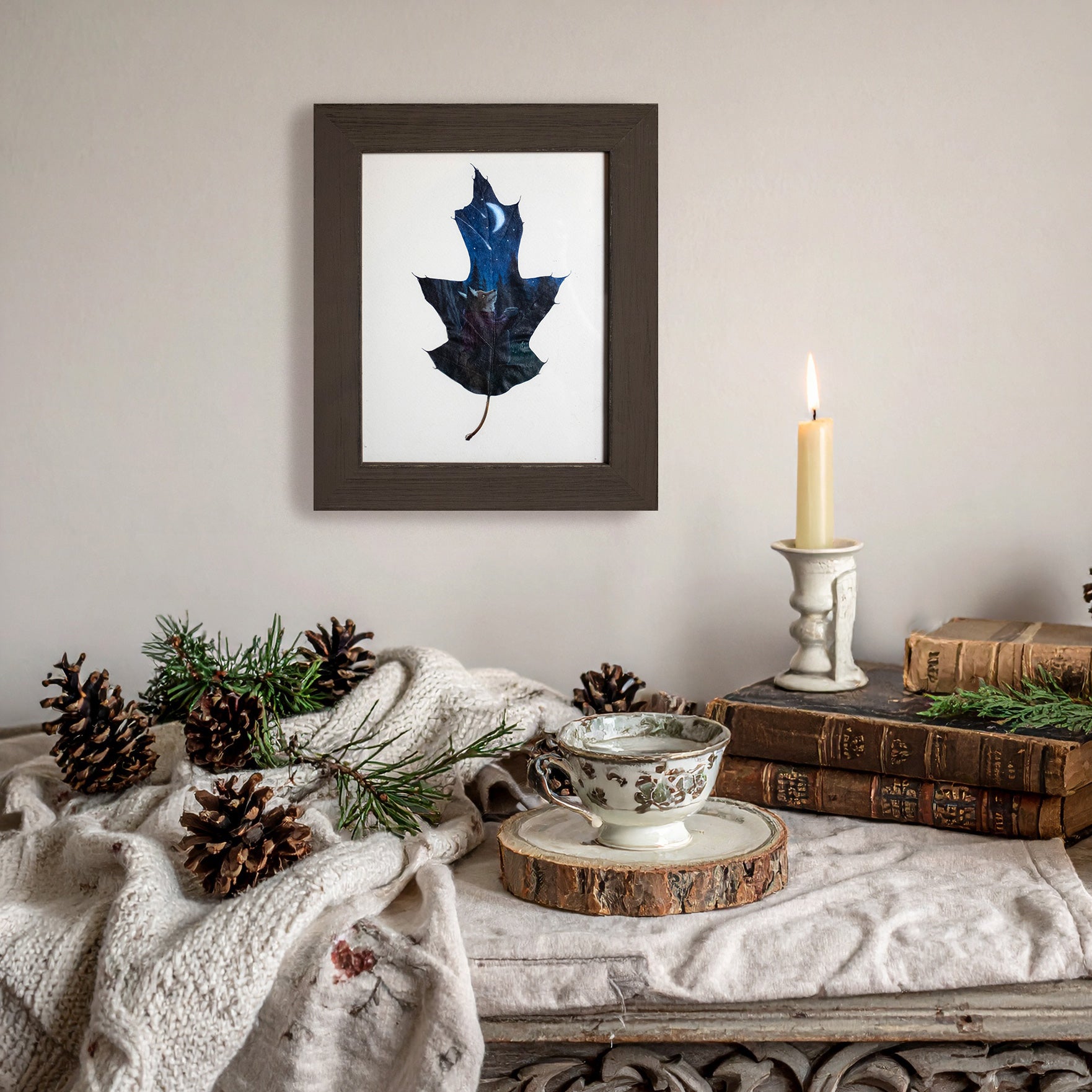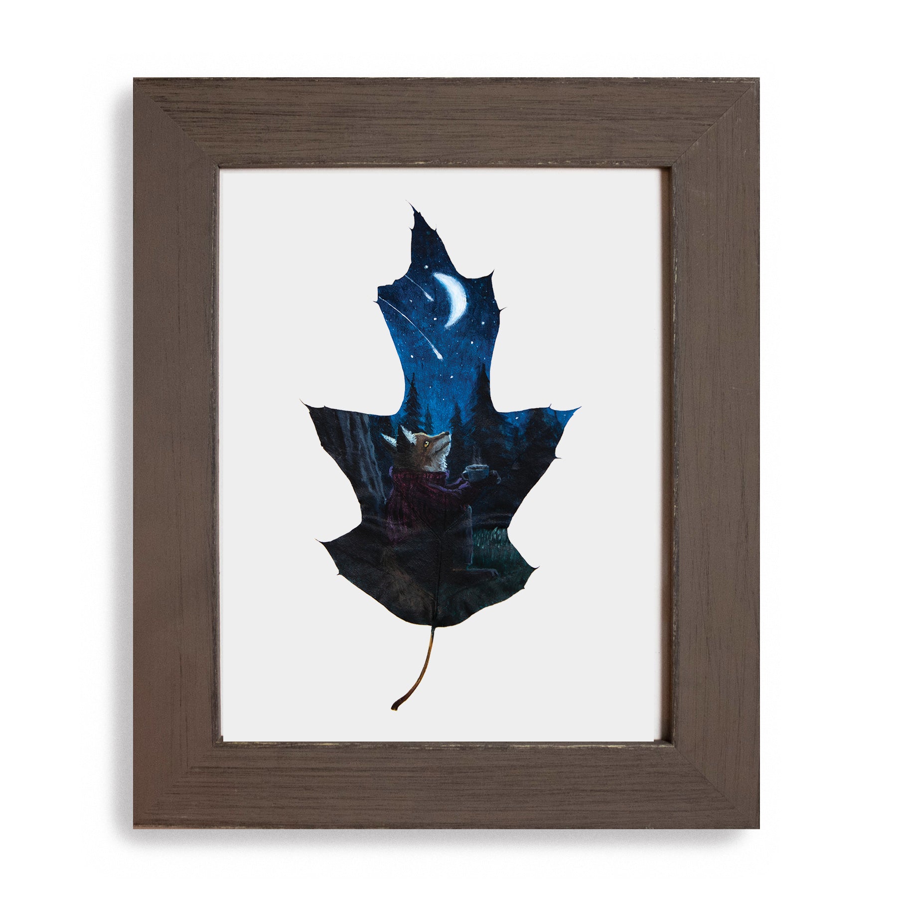 Painted on a real red oak leaf, Tea Beneath the Stars captures a quiet moment of reflection beneath the night sky. A fox sits peacefully in the forest, sipping tea as he gazes at the constellations above—a scene of solitude, meditation, and wonder. This one-of-a-kind artwork invites you to slow down, breathe, and find beauty in stillness.