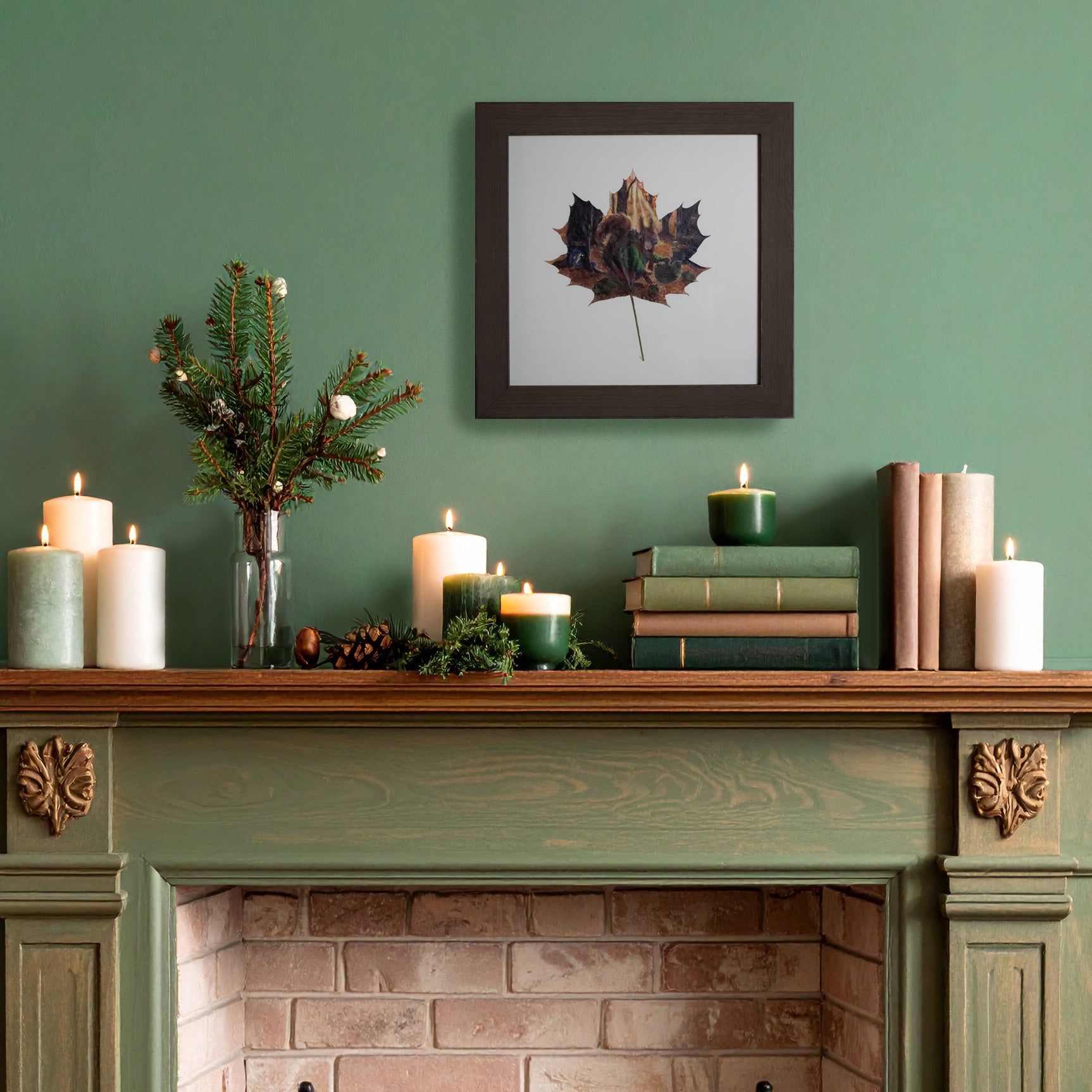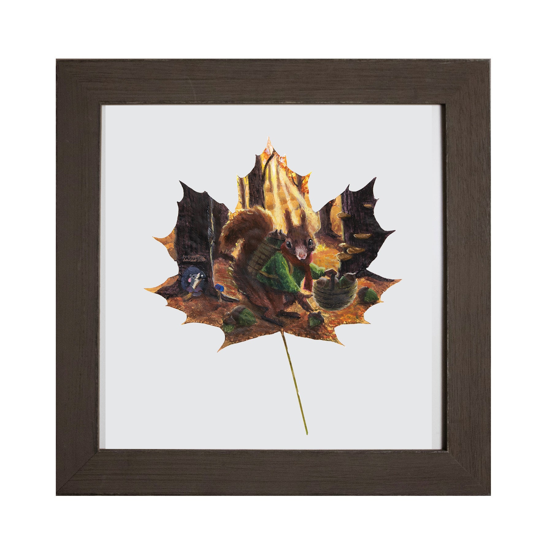 Step into an autumn woodland with The Nut Gatherer, an original painting on a real maple leaf. Beneath the golden canopy, a squirrel gathers baskets of nuts with care, while a tiny mouse peeks curiously from its tree hole home. This enchanting scene celebrates the coziness of fall, the rhythms of nature, and the charm of woodland life, making it a perfect piece to bring storybook wonder into your home.